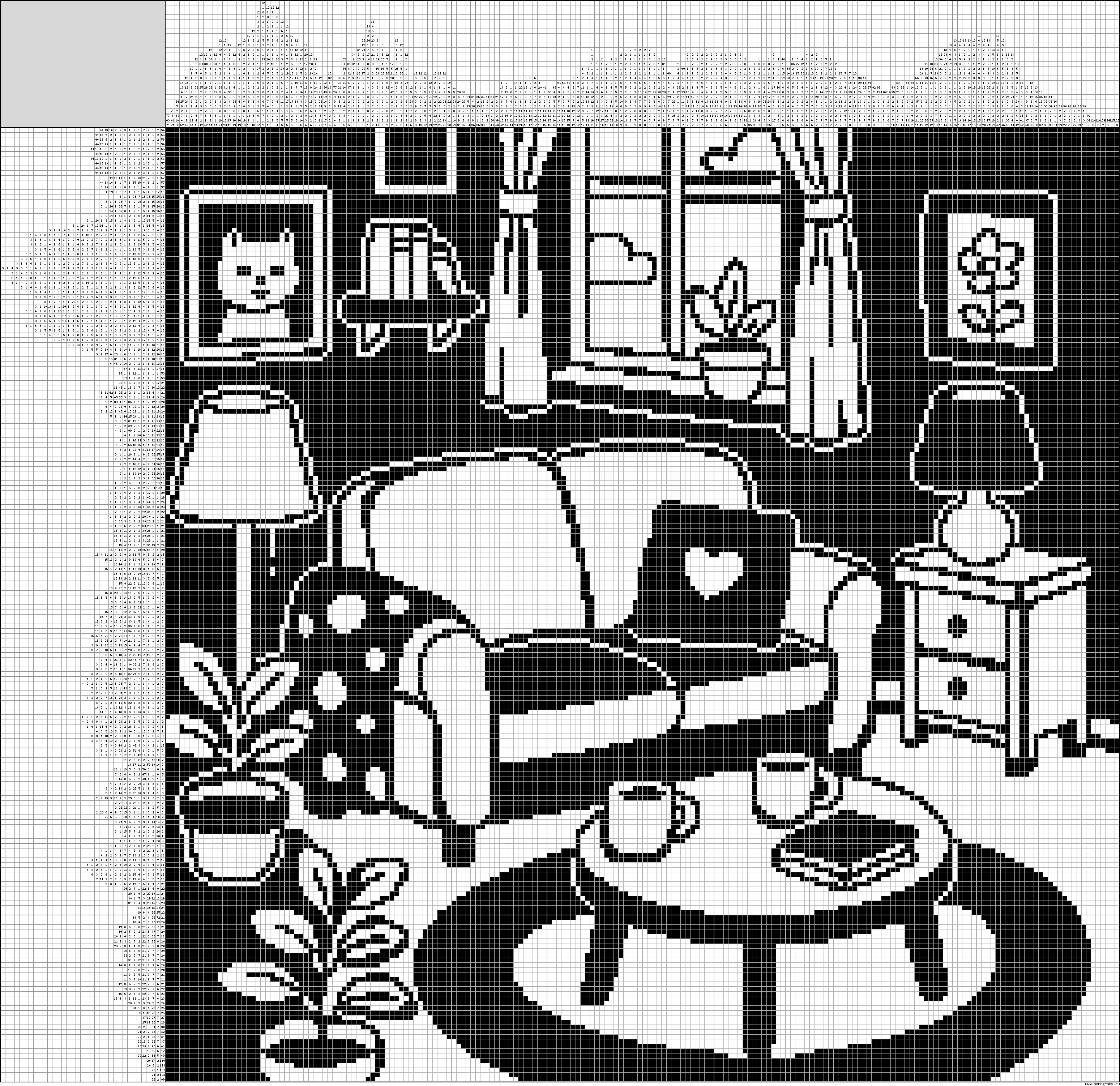 Depth and angles are amazing and posed several challenges along the way. I very much enjoyed doing this gigantic puzzle and was thrilled after the time invested to see that it had a most pleasant conclusion. Many years ago in a Penny Press puzzle book, I learned to love doing nonograms. The puzzle that hooked me then was so similar to this one, but with different contents. Working this brought back pleasant memories of that. Thank you, HarshHugh!